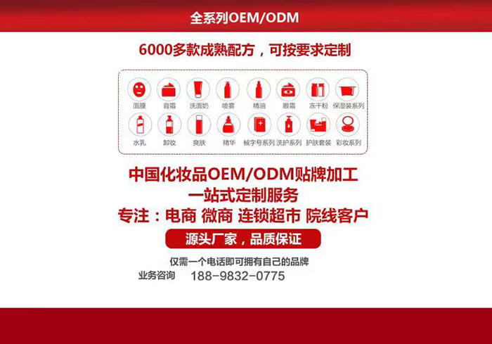 廣州安潔妤化妝品廠——集化妝品研發(fā)、生產(chǎn)、銷售、服務(wù)為一體,公司擁有國內(nèi)研發(fā)實驗室,擁有科研專家50余名,工廠占地面積5萬平方米,建有10萬級GMP制藥標(biāo)準(zhǔn)的 無菌化妝品生產(chǎn)車間,嚴(yán)格按照美國CTFA和歐盟COLIPA行業(yè)品質(zhì)管理規(guī)定進(jìn)行產(chǎn)品開發(fā)和測試,生產(chǎn)品種有祛斑美白、祛痘祛印、修復(fù)、補水保濕、緊致抗皺、眼部護(hù)理、凈白防曬、 院裝系列、中藥系列類、精油養(yǎng)生類等一系列高級護(hù)膚類產(chǎn)品,生產(chǎn)規(guī)模和銷售數(shù)量在專業(yè)線化妝品領(lǐng)域成為行業(yè)領(lǐng)頭羊。廠家超低折扣直供美容院,OEM加工屬于你自己的品牌。主要的是公司將提供美容專業(yè)培訓(xùn),銷售營銷培訓(xùn),美容院管理培訓(xùn),提供實地的拓客鎖客的方案等。公司秉承以用戶需求為核心,堅持“質(zhì)量到位、服務(wù)優(yōu)質(zhì)”的經(jīng)營理念,以為客戶創(chuàng)造價值為己任,期待為您服務(wù)!